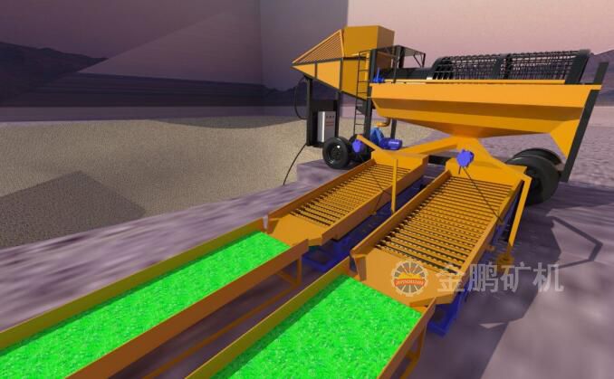 原礦通過礦用自卸車運(yùn)輸?shù)竭x金車礦倉,礦倉上設(shè)有格篩防止大塊礦石進(jìn)入到分級(jí)洗礦篩對(duì)篩子造成危害,礦石在篩子內(nèi)通過高壓水的沖洗使礦石、泥土、顆粒金分開。篩上產(chǎn)品通過皮帶運(yùn)輸機(jī)直接運(yùn)輸?shù)綇U料堆廠,篩下產(chǎn)品經(jīng)過鼓動(dòng)溜槽先進(jìn)行富集,然后再自流至固定溜槽進(jìn)一步回收有價(jià)金,通過兩次選別作業(yè)顆粒金的回收率可高達(dá)70%以上。我公司生產(chǎn)的移動(dòng)式砂金選礦車解決了原來固定式運(yùn)輸成本高的弊病更適合旱地選金。