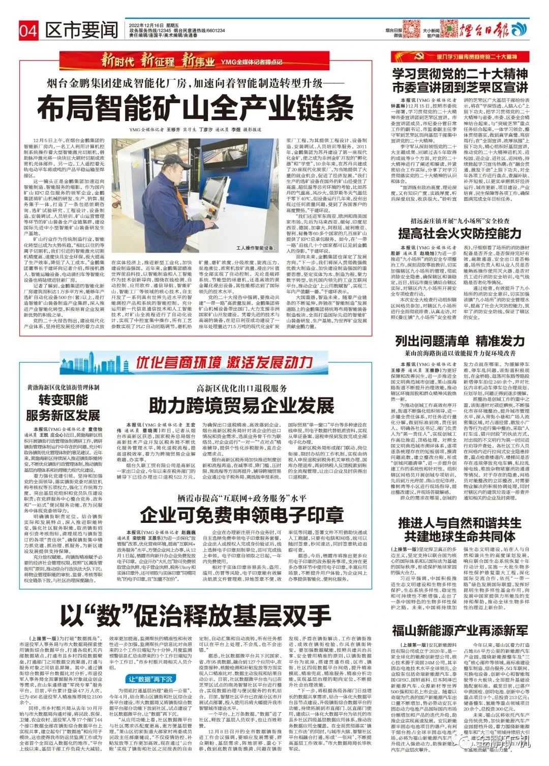 今天(12月16日),《煙臺(tái)日?qǐng)?bào)》以《新時(shí)代 新征程 新偉業(yè)|煙臺(tái)金鵬集團(tuán)布局智能礦山全產(chǎn)業(yè)鏈條》為題,大篇幅報(bào)道金鵬礦機(jī)緊緊抓住“一帶一路”發(fā)展機(jī)遇,圍繞“大國重器,智造未來”,統(tǒng)籌布局智能裝備制造板塊,實(shí)現(xiàn)高質(zhì)量快速發(fā)展。