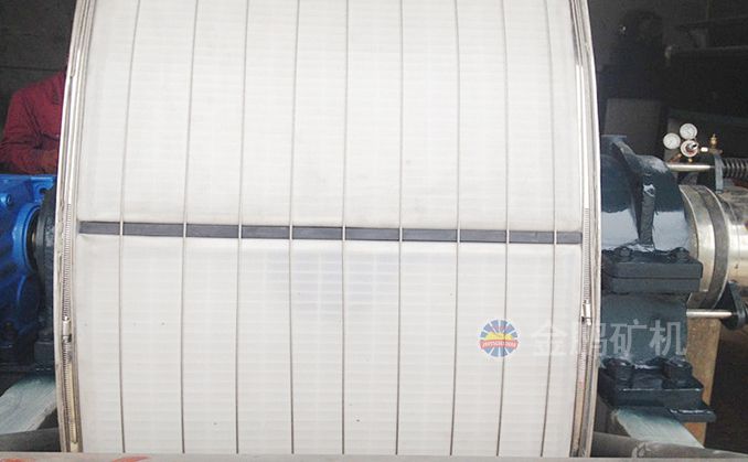 整個筒體外面裹著濾布,為了保證每室之間的密封,濾布用膠條、麻繩或棕繩嵌在隔條的繩槽內(nèi)。然后再用繞線機構在筒體外面沿軸向以50-80mm的間距纏繞很多道鋼絲,把濾布固定在筒體上。
