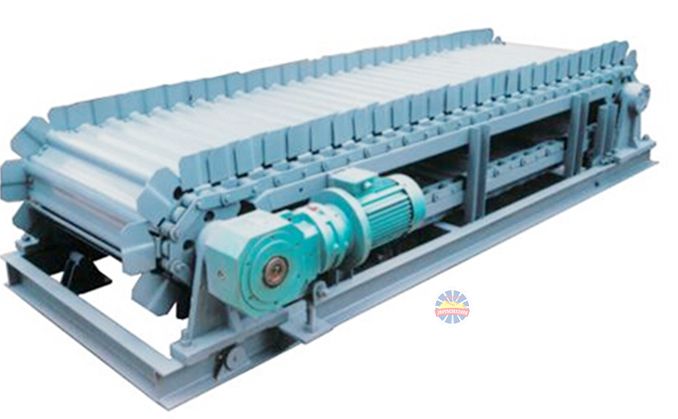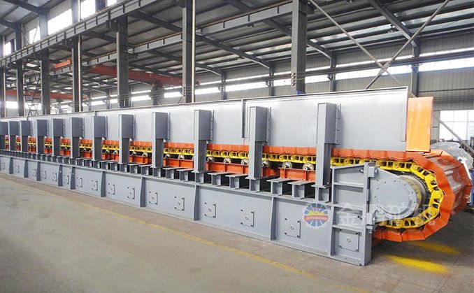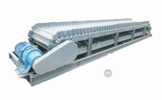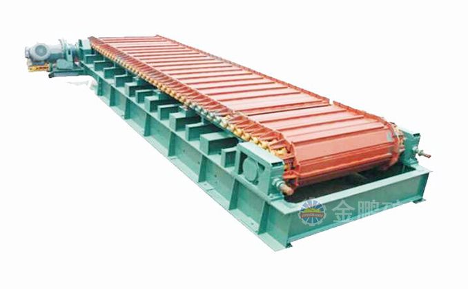 采用節(jié)距為150mm的高強(qiáng)度模鍛鏈條為牽引件,兩根鏈條繞過安裝在機(jī)體頭部的一對驅(qū)動鏈輪和機(jī)體尾部的一對張緊輪聯(lián)成封閉形回路,在兩排鏈條的每個鏈節(jié)上裝配了相互交迭的、輕型結(jié)構(gòu)的輸送槽而成為一個連續(xù)的能夠運(yùn)載物料的輸送線路。其自重和物料的重量由安裝在機(jī)體上的多排支重輪、鏈托輪和滑道梁支承。傳動系統(tǒng)經(jīng)交流變頻調(diào)速電動機(jī)聯(lián)接減速機(jī),再由漲套與驅(qū)動裝置直聯(lián)驅(qū)動運(yùn)載機(jī)構(gòu)低速運(yùn)行。將尾部料倉卸入的物料沿輸送線路運(yùn)至機(jī)體的前方排出,實現(xiàn)向下方的工作機(jī)械連續(xù)均勻喂料的目的。