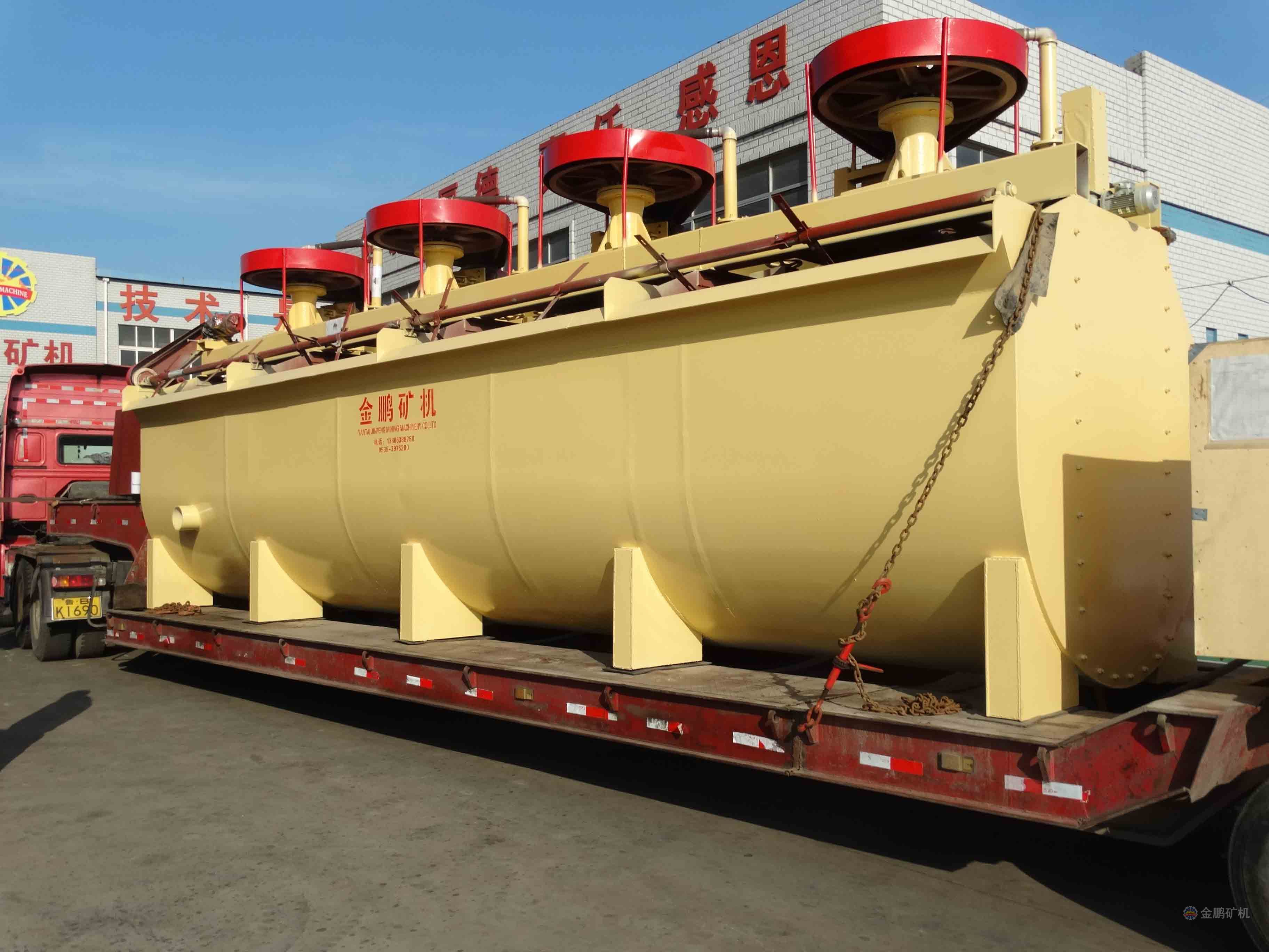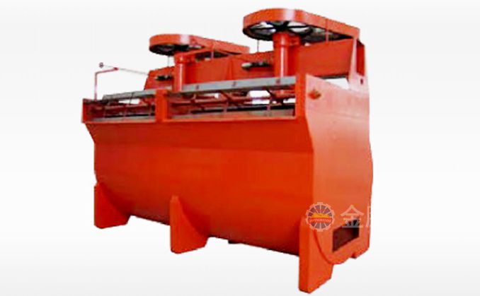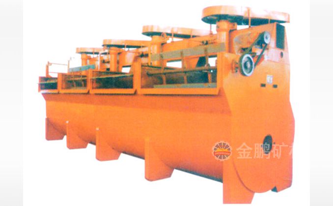 該浮選機工作時,隨著葉輪的旋轉(zhuǎn),槽內(nèi)礦漿從四周經(jīng)槽底由葉輪下端吸到葉輪葉片之間由鼓風機給入的低壓空氣經(jīng)空心軸和葉輪腔的空氣分配器,也進入其中。礦漿與空氣在葉片之間充分混合后,從葉輪上半部周邊向斜上方推出,由定子升穩(wěn)流和定向后進入整個槽子中。氣泡上升到泡沫穩(wěn)定區(qū),礦化富集后,自溢流堰溢出。另一部分礦漿向葉輪下部流去,再經(jīng)攪拌,重新混合形成礦化氣泡。剩余的礦漿流向下一槽直至最終成尾礦。