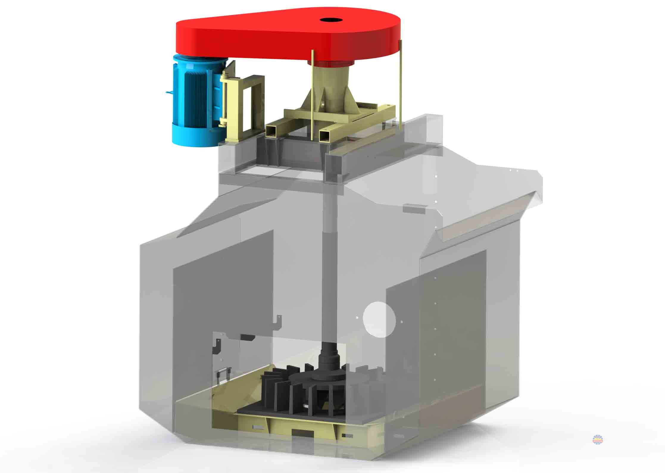 當(dāng)浮選機(jī)葉輪旋轉(zhuǎn)時,來自鼓風(fēng)機(jī)的低壓空氣通過分配器周邊的孔進(jìn)入葉輪葉片間,與此同時假底下面礦漿由葉輪下部被吸入到葉輪葉片間,礦漿和空氣在葉輪葉片間充分混合后,從葉輪上半部周邊排出,排出的礦漿空氣混合物由定子穩(wěn)流后,穿過格子板,進(jìn)入槽內(nèi)上部區(qū)。此時浮選機(jī)內(nèi)部區(qū)礦漿中含有大量氣泡,而外側(cè)循環(huán)通道內(nèi)礦漿中不含氣泡(或古有極少量氣泡),于是內(nèi)外礦漿就形成壓差,在此壓差及葉輪抽吸力作用下,內(nèi)部區(qū)礦漿和氣泡在設(shè)定的流速下起上升通過格子板,將粗顆粒礦物帶到格子板上方,形成粗顆粒礦物懸浮層,而礦化氣泡和含有較細(xì)礦粒的礦漿則繼 續(xù)上升,礦化氣泡升到液面形成泡沫層,含有較細(xì)礦粒的礦漿則越過隔板經(jīng)循環(huán)通道,進(jìn)入葉輪區(qū)加入再循環(huán)。